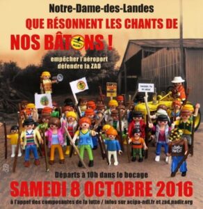 Letzten Herbst sollte die gesamte Zone geräumt werden, um den absurden Flughafenbau zu beginnen. Am 8. Oktober 2016 hatten sich Zehntausende versammelt, um die Entschlossenheit der Bewegung zu demonstrieren. In Anerkennung des Kampfes der Landwirt*innen in den letzten Jahrzehnten brachten tausende Demonstrierende Holzstäbe mit, die sie in der Zone zurückließen als Zeichen eines kollektiven Versprechens. Sie werden zurückkommen und sie aus dem Boden ziehen, um die ZAD zu verteidigen, sobald dies nötig sein wird. Nach einigen spannungsreichen Monaten gab die Regierung den Räumungsplan für diese Saison auf. Die neugewählte Regierung könnte die Zone jedoch in den kommenden Monaten wieder in Räumungsgefahr versetzen.